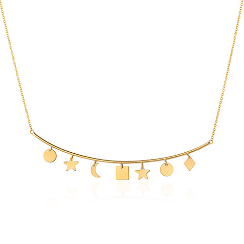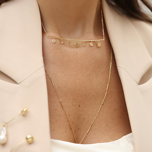 This 18K yellow gold choker, inspired by the elegance of a galaxy, features intricate shapes that shine like stars. Wear it alone or layer it with other pieces for a radiant, celestial look.
