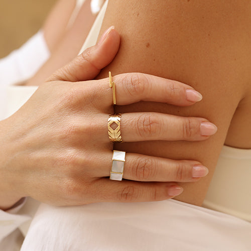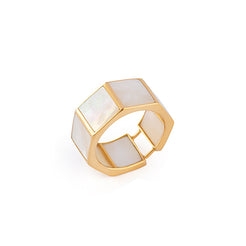 The Lunara Ring, crafted from 18K yellow gold and adorned with mother of pearl, embodies elegance and uniqueness. Its exquisite design stands out, with the iridescent mother of pearl adding a distinctive touch. A perfect blend of luxury and natural beauty, this ring is made to make a statement.