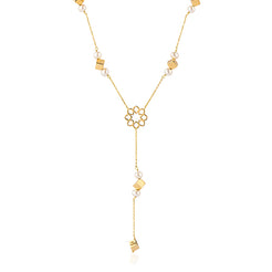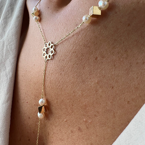 A refined and elegant rosary necklace that enhances every woman's décolleté. Crafted with 18k yellow gold cubes and Baroque pearls, each piece is a unique statement of sophistication.