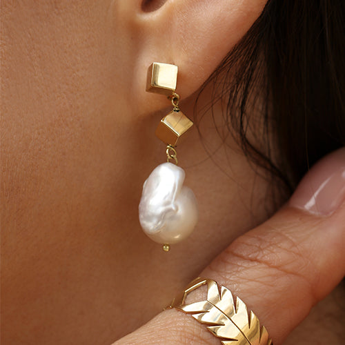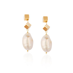 Crafted from 18K gold, these earrings feature two sleek gold cubes paired with a striking baroque pearl. The contrast between the geometric cubes and the organic form of the pearl creates a uniquely iconic design, making these earrings a standout piece in any collection.