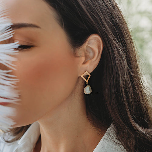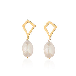 These stunning earrings feature a unique rhombus shape crafted from 18K gold, elegantly paired with a baroque pearl. The geometric design of the rhombus contrasts beautifully with the organic form of the pearl, creating a sophisticated and eye-catching piece that's both modern and timeless. Perfect for making a subtle yet bold statement.